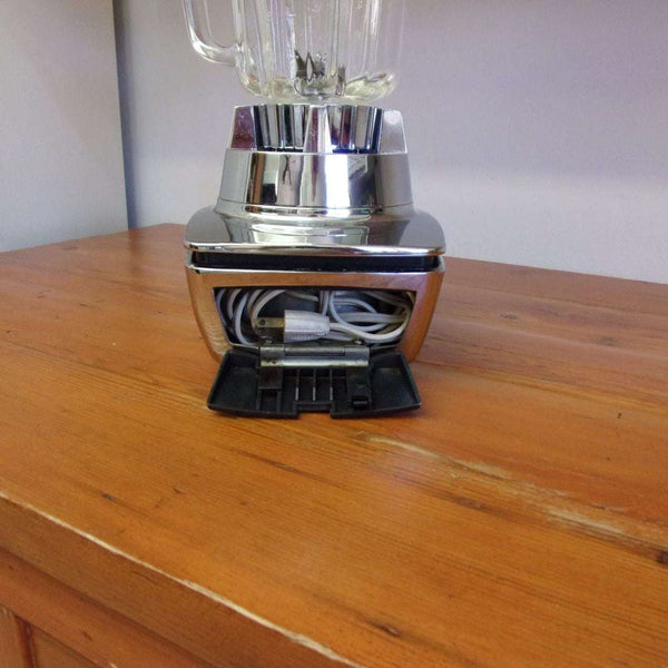 This is a beautiful Vintage Hamilton Beach Deluxe Liqui Blender Chrome . It features a hidden cord storage drawer in the back. The container is glass and is marked from 2 Oz, 1/4 cup all the way up to 40 Oz, 5 Cups on both sides, and the base is chrome has a lever across the front with 7 settings.