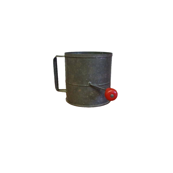 This is a Vintage Commercial Hodges Flour Sifter with Red knob. Great for rustic primitive farmhouse kitchen decor, or add to a collection of antique, vintage kitchen tools, gadgets, sifters.