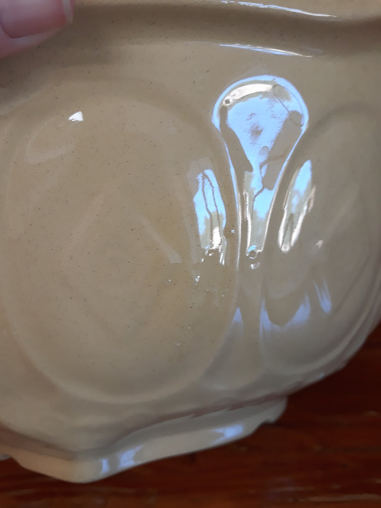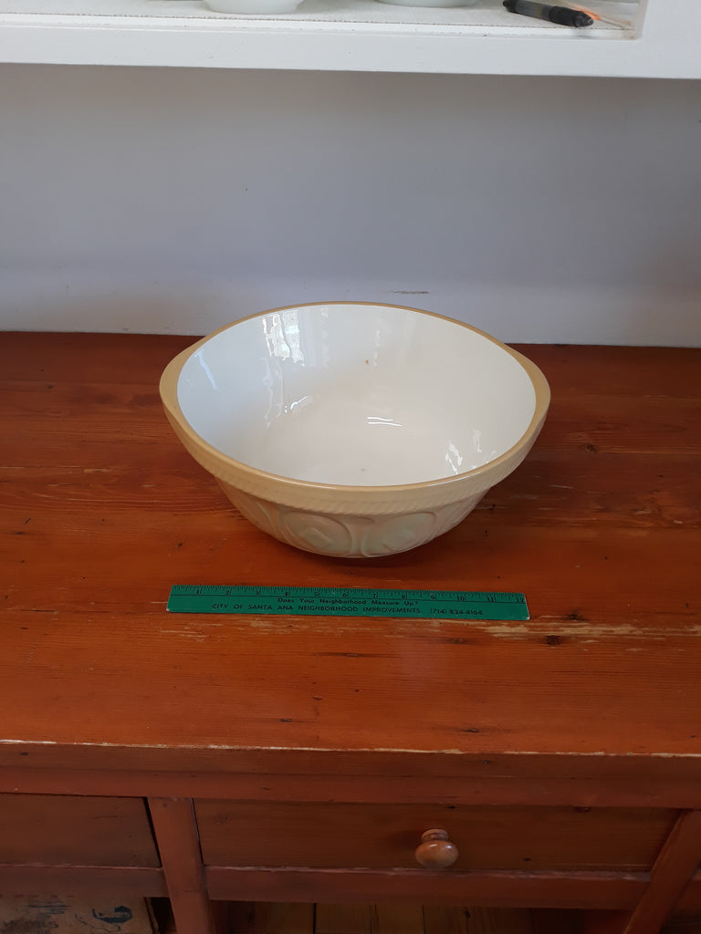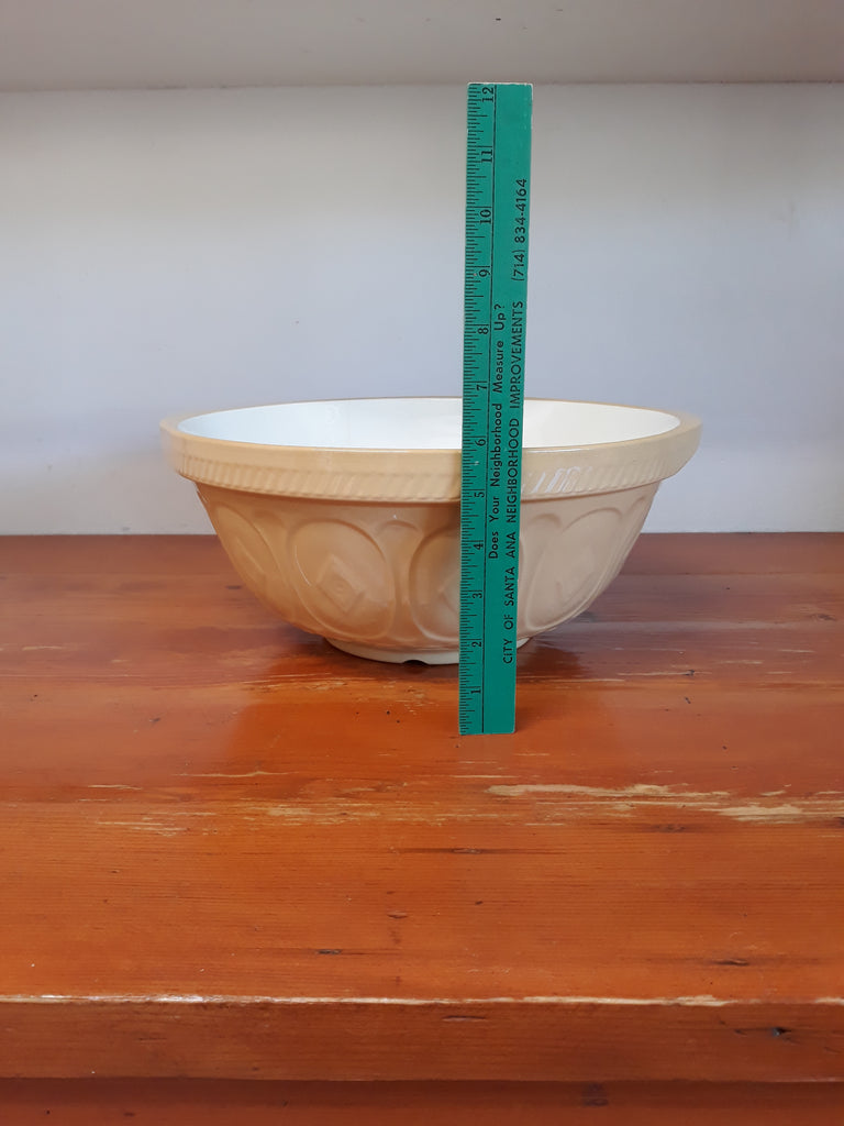 This is a vintage made in England ceramic mixing bowl. It features a tan colored glaze with oval with flower in center pattern design around the center of the body and a white glaze interior. Perfect addition to any primitive farmhouse kitchen, add to a collection of antique, vintage stoneware, yelloware bowls, dishes.