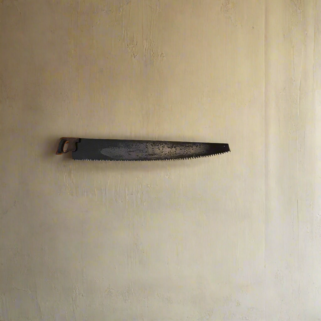 This is an antique vintage Warranted Superior two man logging saw with a leather wrapped handle. Really cool unique rustic old carpentry tool to add to a collection of antique, vintage tools. Hang on a wall as decor in your primitive farmhouse, rustic cabin.